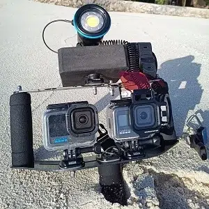 - 2x GoPro im Unterwassergehäuse mit verklebten und am Stativ verschraubten Mounts ( jeweils Senkschraube mit selbst hemmender Mutter in der Mitte der Mounts)